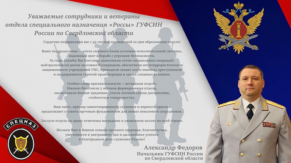 Руководство ГУФСИН России по Свердловской области поздравляет сотрудников и ветеранов отдела специального назначения «Россы» с 35-летней годовщиной со дня образования отдела!